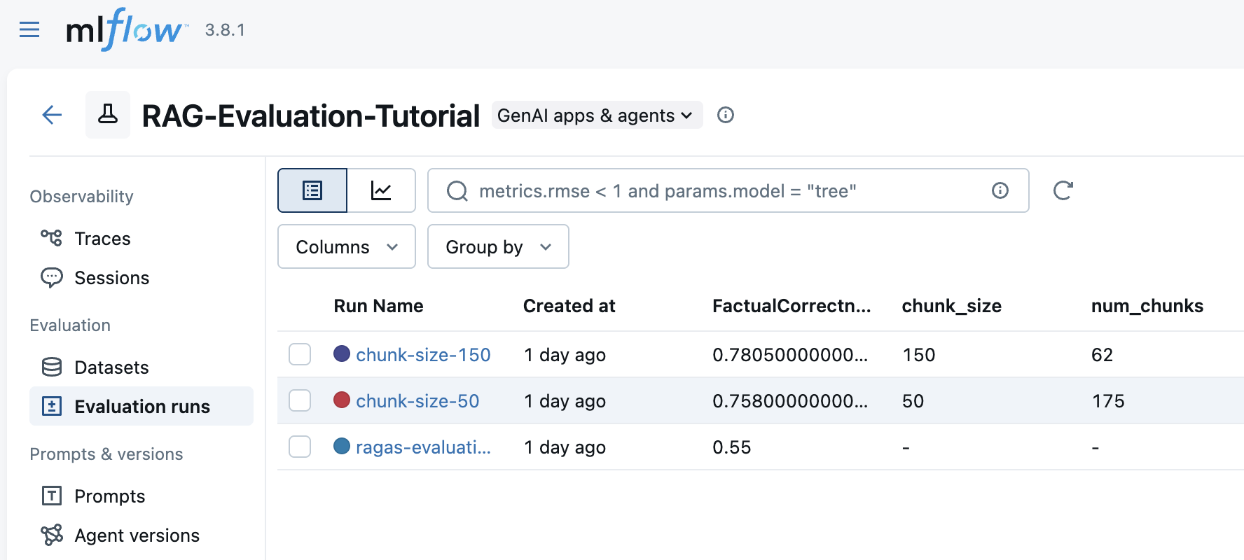 ✨ Evaluation completed. Metrics and evaluation results are logged to the MLflow run: Run name: chunk-size-150 Run ID: c77546d4d930426b98ebeb1bf1a09a3f To view the detailed evaluation results with sample-wise scores, open the Traces tab in the Run page in the MLflow UI. ✓ Run ID: c77546d4d930426b98ebeb1bf1a09a3f ============================================================ Completed 2 experiments. Run IDs saved for comparison.
